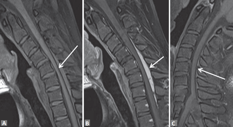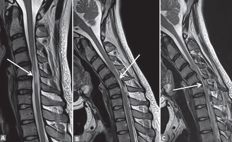 Figure 1: T2-weighted sagittal magnetic resonance imaging in neutral position (a) and in neck flexion (b and c) demonstrate anterior displacement of the posterior dura (white arrow in b) with thinning of the spinal and myelomalacia (white arrow in a and c). Epidural fl ow voids posterior to dura also seen (b and c)
