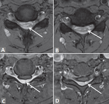 Magnetic resonance imaging studies in neck flexion will show the forward displacement of the posterior wall and a well-enhanced crescent-shaped mass in the posterior epidural space of the lower cervical canal. [7] Atrophy of the lower cervical cord in a neutral position, abnormal cervical curvature (straight or kyphotic), loss of
