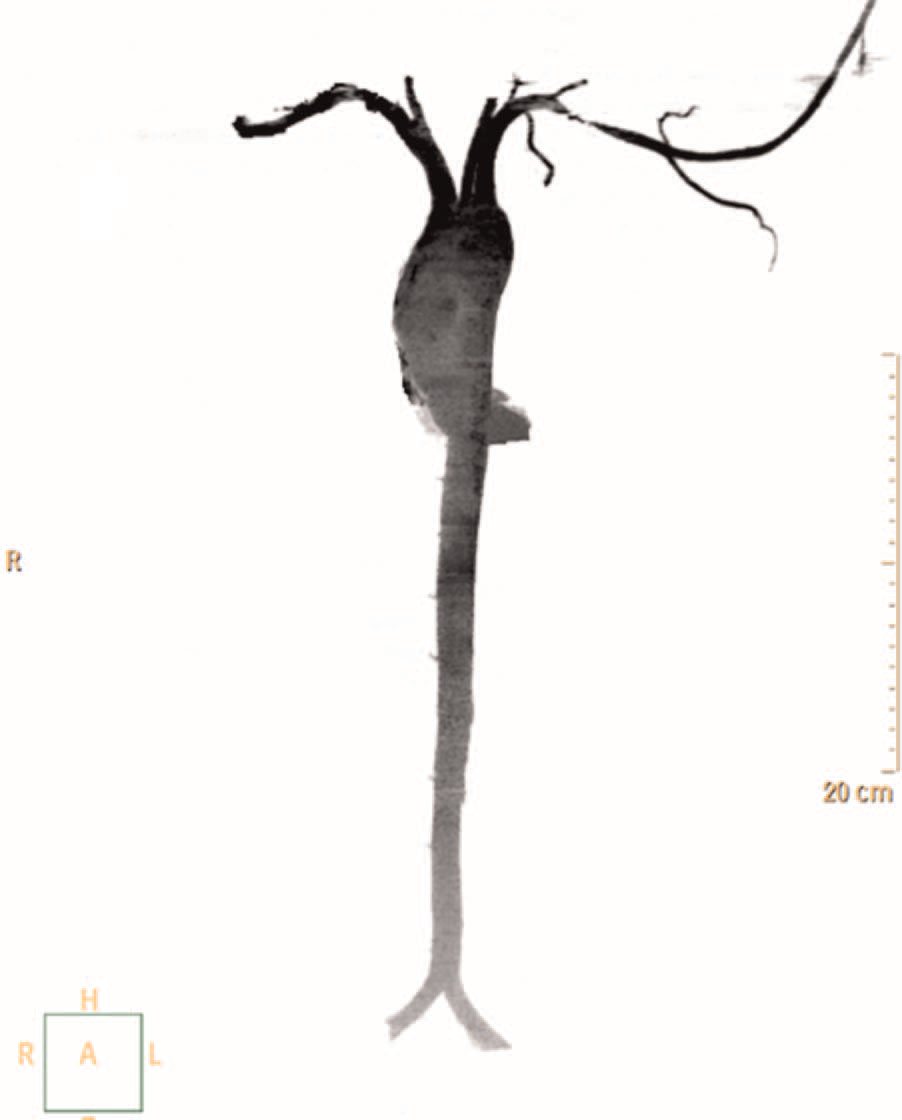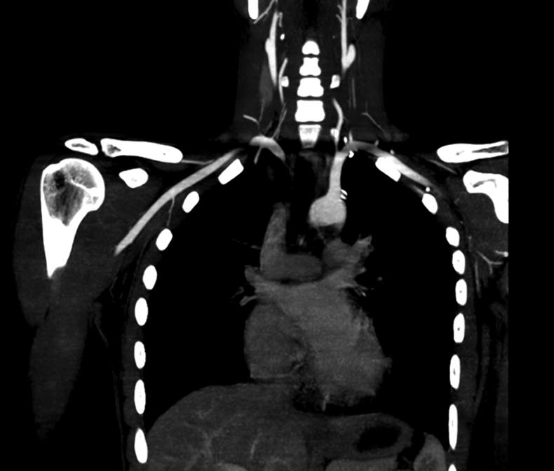 A 27-year-old man was referred for endovascular intervention to the left subclavian artery. There was no history of giddiness or claudication pain in the upper extremities. On examination, the left upper limb pulses were feeble. Blood pressure was 160/ 90 mm Hg in the right upper limb and 110/90 mm Hg in the left upper limb. There was a bruit in the left supraclavicular area. Routine blood investigations, including inflammatory markers, were normal. CT angiography revealed a discrete narrowing of the third part of the left subclavian artery (figure 1). A diagnosis of aorto-arteritis was considered, based on American College of Rheumatology criteria. However, there was no thickening of the vessel wall. The patient was re-evaluated. Wright’s hyperabduction test was performed.1 The signs disappeared with the arm in an adducted position and were reproduced in the abducted position. Repeat CT in the adducted position showed no evidence of subclavian obstruction (figure 2). A diagnosis of dynamically induced arterial thoracic outlet syndrome was made.