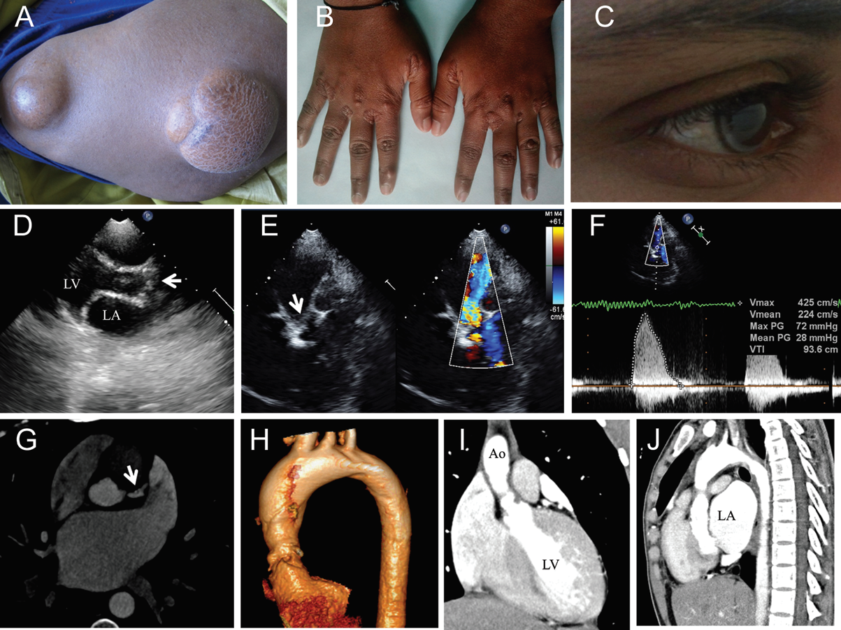 As she was asymptomatic with a negative exercise treadmill test for inducible ischaemia and a normal CT coronary angiogram she was kept on high-dose statins and ezetimibe. At 6 weeks of follow-up her LDL cholesterol remained high at 620 mg% without any new symptoms. She was advised LDL apheresis and surgery for supra valvular aortic stenosis if symptomdevelops. Though her LDL receptor studies were not available her lipid profile, dyslipidaemic pattern in parents, early onset of xanthomas, and poor response to pharmacotherapy are all consistent with homozygous type II FH. Supra valvular aortic stenosis secondary to large atherosclerotic plaques at the aortic root is an uncommon but a specific association with this form of FH and subsequent risk stratification can be done with currently available noninvasive imaging modalities in asymptomatic patients. Magnetic resonance imaging or transoesophageal echocardiogram can better delineate these plaques.