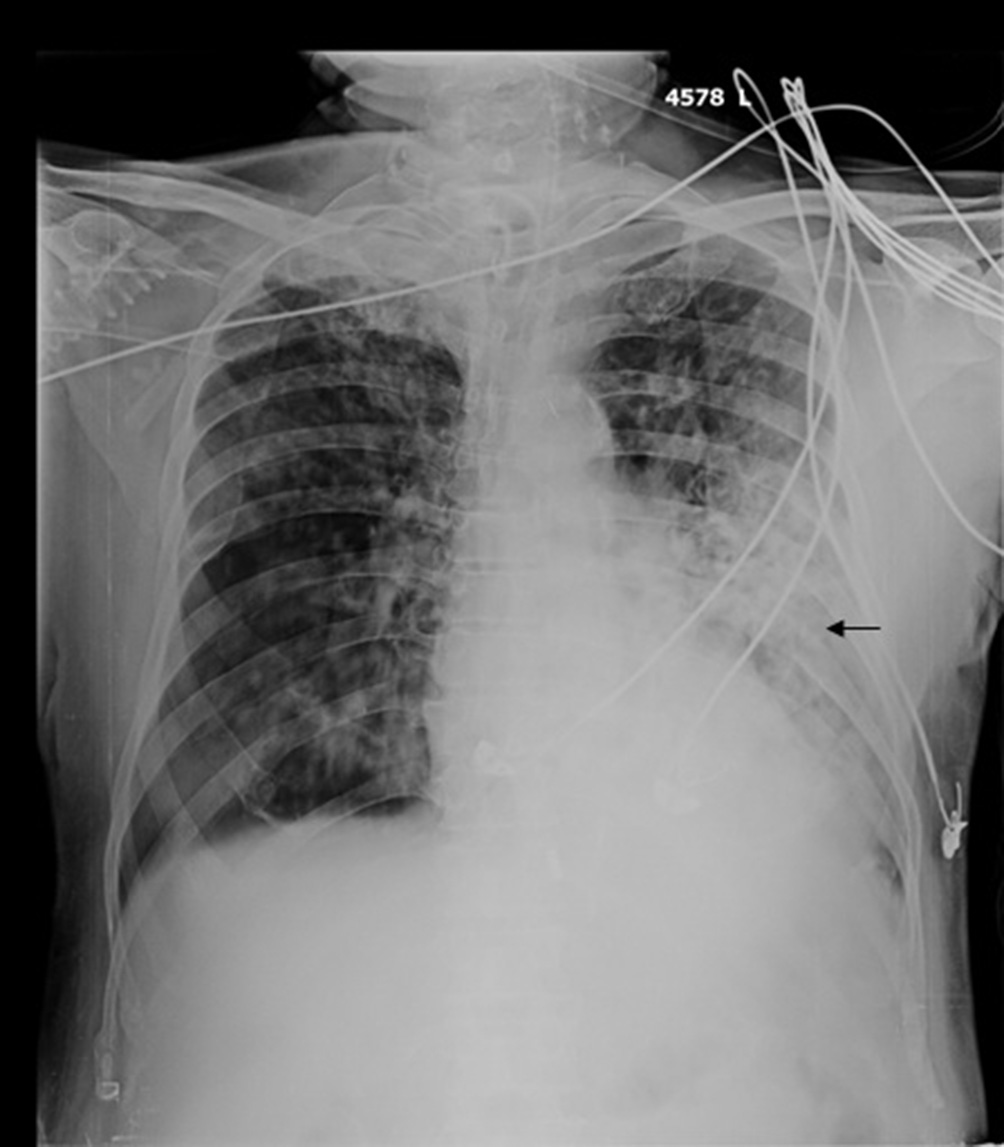 Fig. 2. CT transverse section shows large area of consolidation (arrow) in