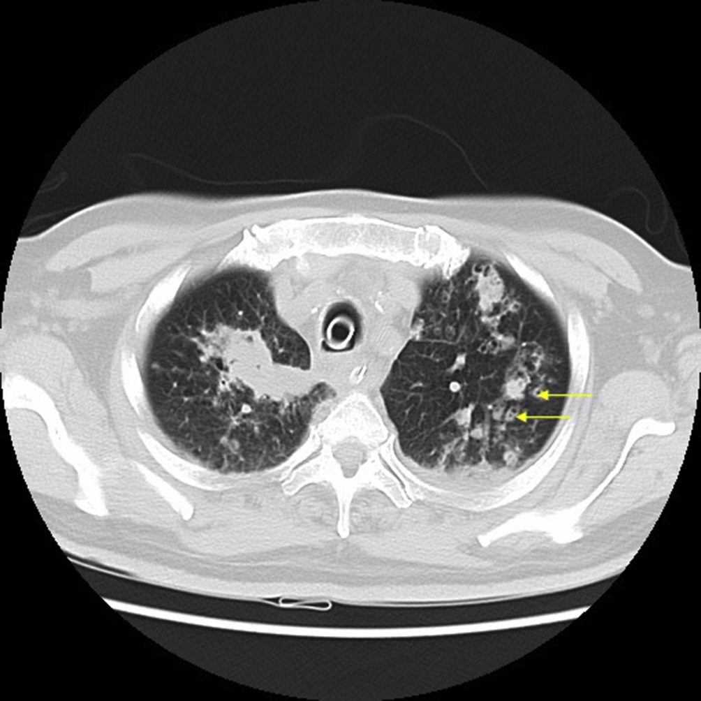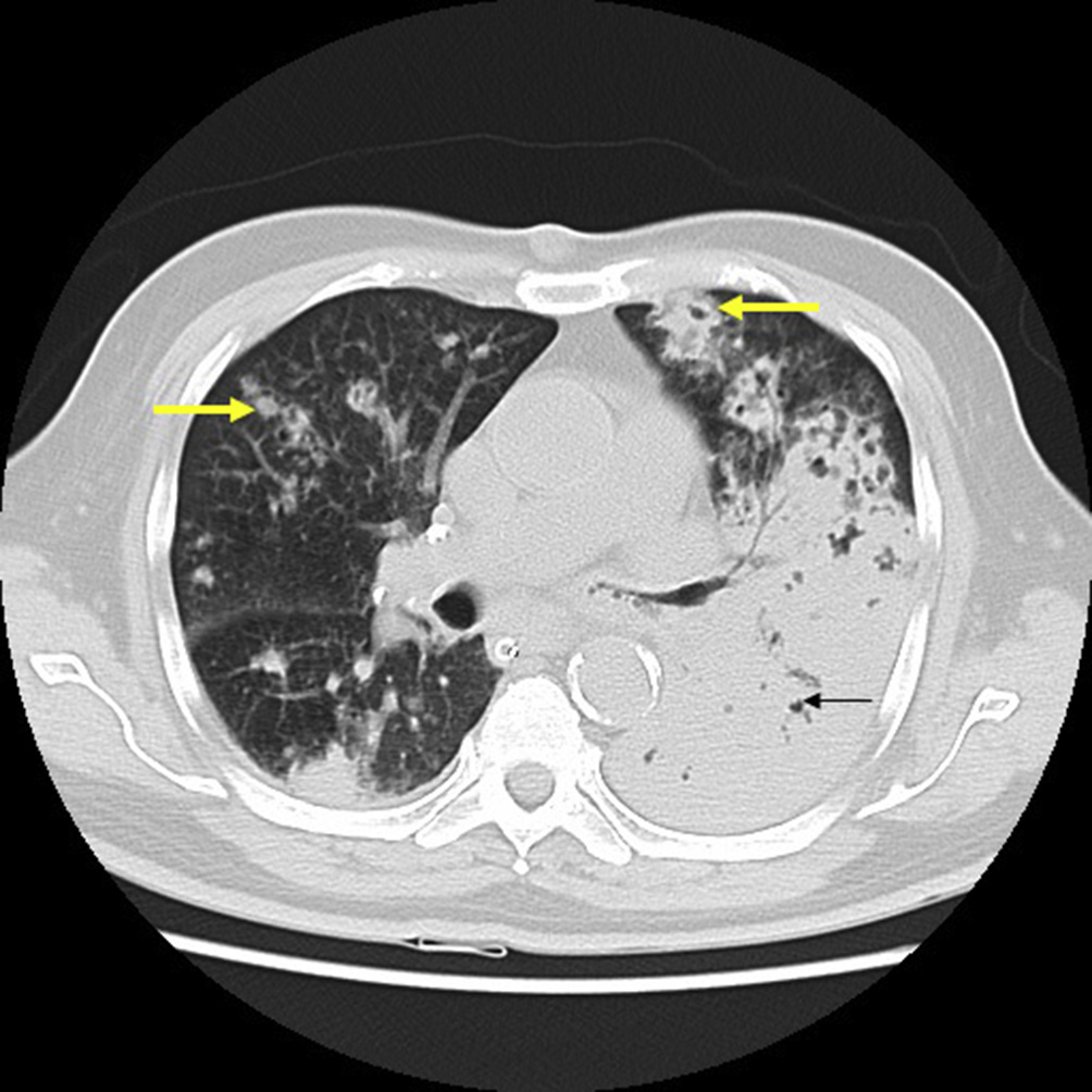 bilateral upper lobes with central cavitation (arrows) in a few lesions on left.
