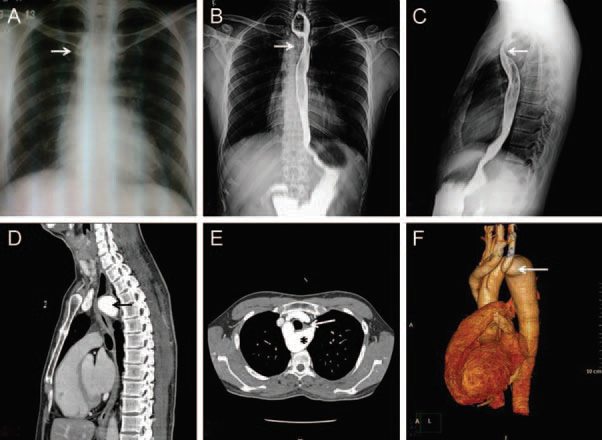 Panel A Chest radiograph showing right-sided aortic arch (arrow). Panels B and C Barium swallow imaging showing extrinsic compression on right side (B) and on posterior aspect (C) of oesophagus (arrows). Panels D and E Computed tomography aortogram showing large aortic diverticula (asterisk) with retroesophageal extension causing marked compression on the oesophagus (arrow). (F) Computed tomography volume rendered aortography showing right-sided aortic arch with anomalous origin of left common carotid from ascending aorta and left subclavian artery arising from aortic diverticulum.